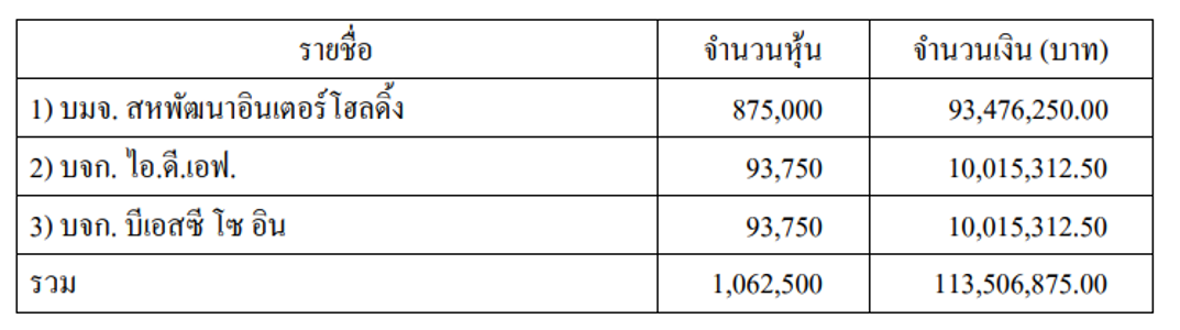 มูลค่ารวมของรายการ: หุ้นสามัญจำนวน 1,062,500 หุ้น ราคาหุ้นละ 106.83 บาท (ราคาที่ตกลงร่วมกันและอยู่ในช่วงมูลค่ายุติธรรมโดยวิธีอัตราส่วนราคาต่อบัญชีซึ่งมีค่าเฉลี่ย 2.02) เป็นเงินสด 113,506,875 บาท ผ่านการชำระด้วยเงินสดเพียงครั้งเดียว